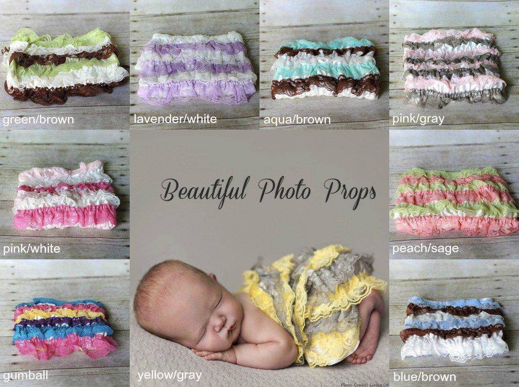 How adorable are these little strapless striped lace ruffle rompers? Made of stretchy fabric and row after row of yummy ruffles, these are just perfect for your newborn to toddler photos! Similar to a tube top, with a split for the legs…there is a lot of "forgiveness" so they can stretch or shrink to fit older or younger babies. Small rompers are strapless and fit 0-12 months. Large size does have straps and fits 10 months up to size 3T.