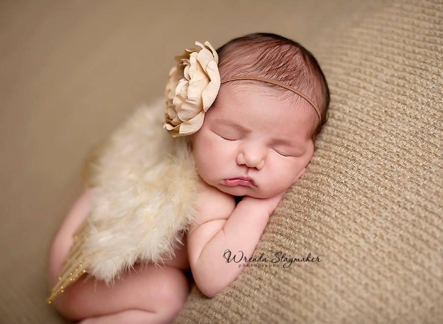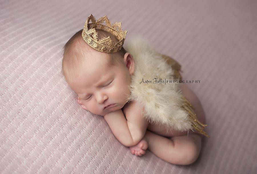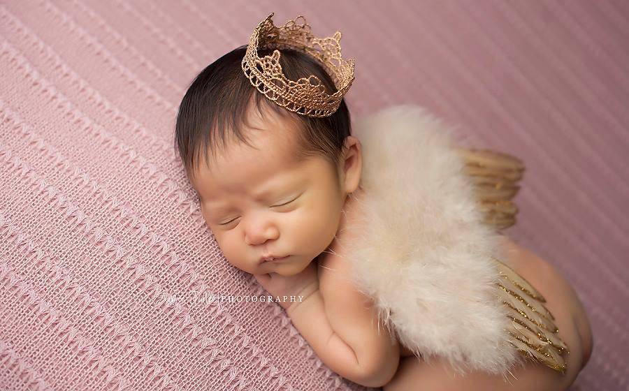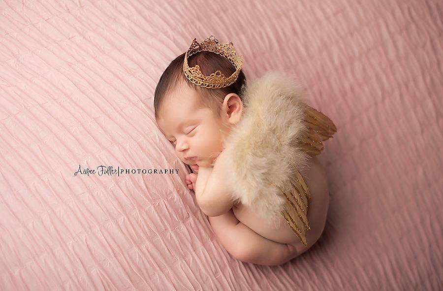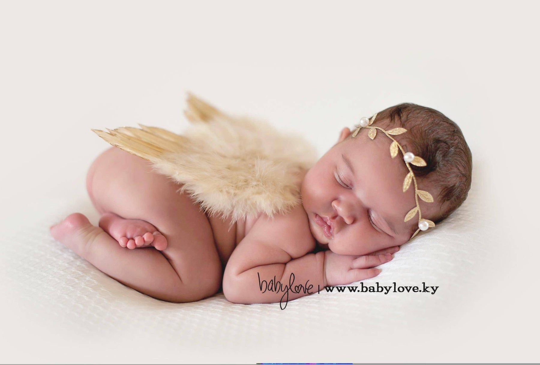 Our angel wings are perfect for infant and newborn photo sessions! They are also great used as costumes. Made of soft, creamy feathers dipped in sparkles, they measure around 7.5 inches x 6 inches. These are the same as the gold feather wings featured in our shop, just shown in a different pose and lighting.