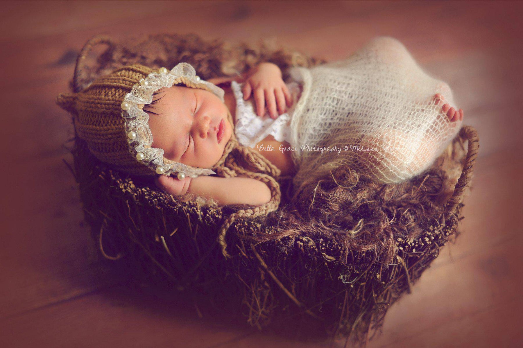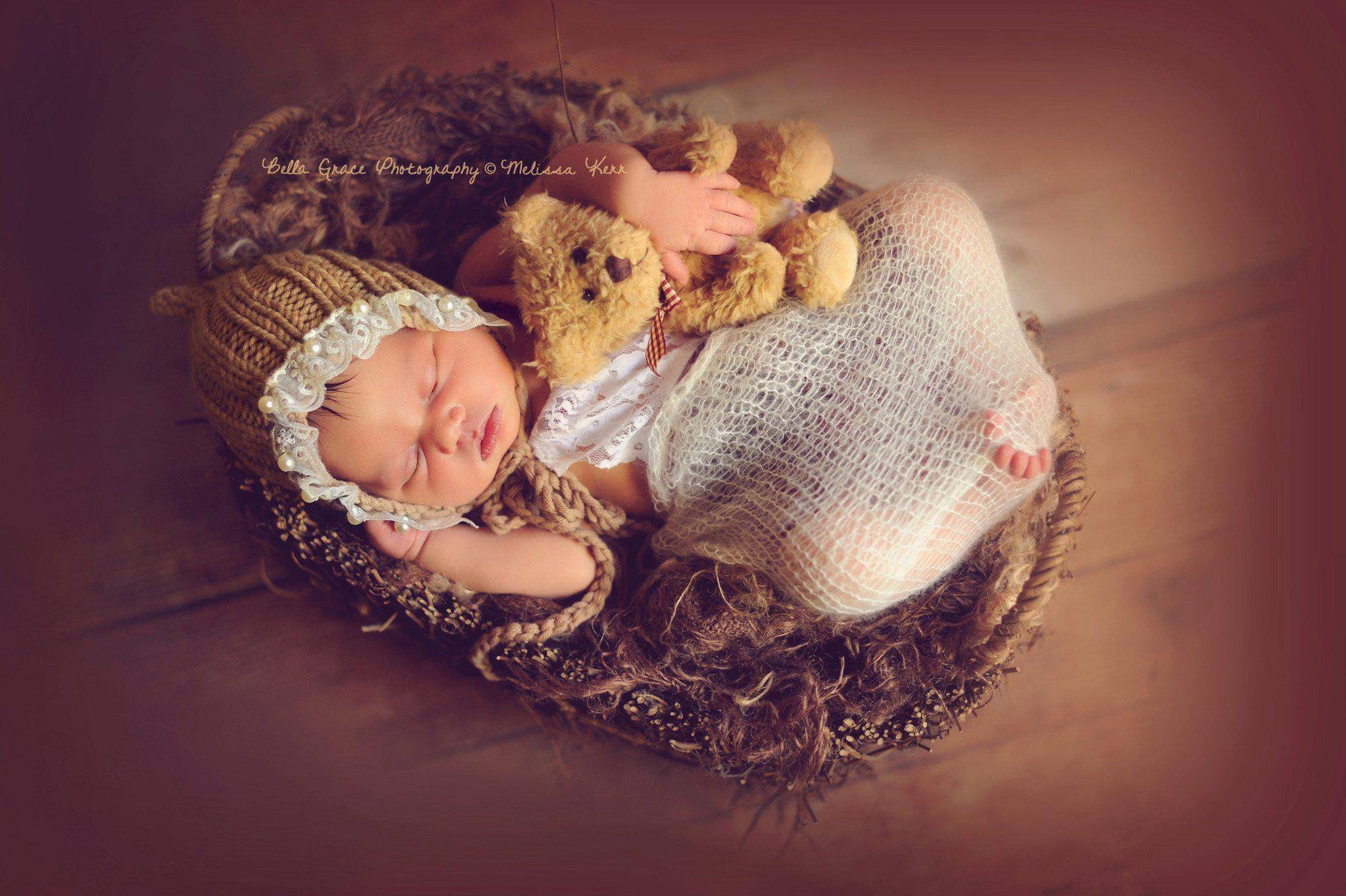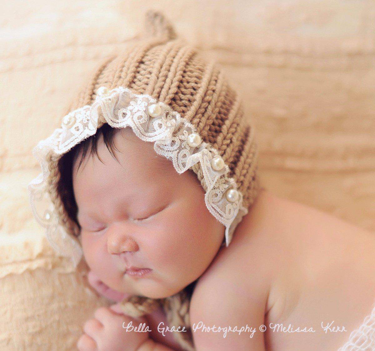 Part of our Natural Newborns organic line! This adorable knit cotton bonnet hat in toffee brown with lace and pearl trip is the perfect hat for your little newborn photos! It is made from a soft organic cotton yarn and is the perfect size for your sweet little newborn :)