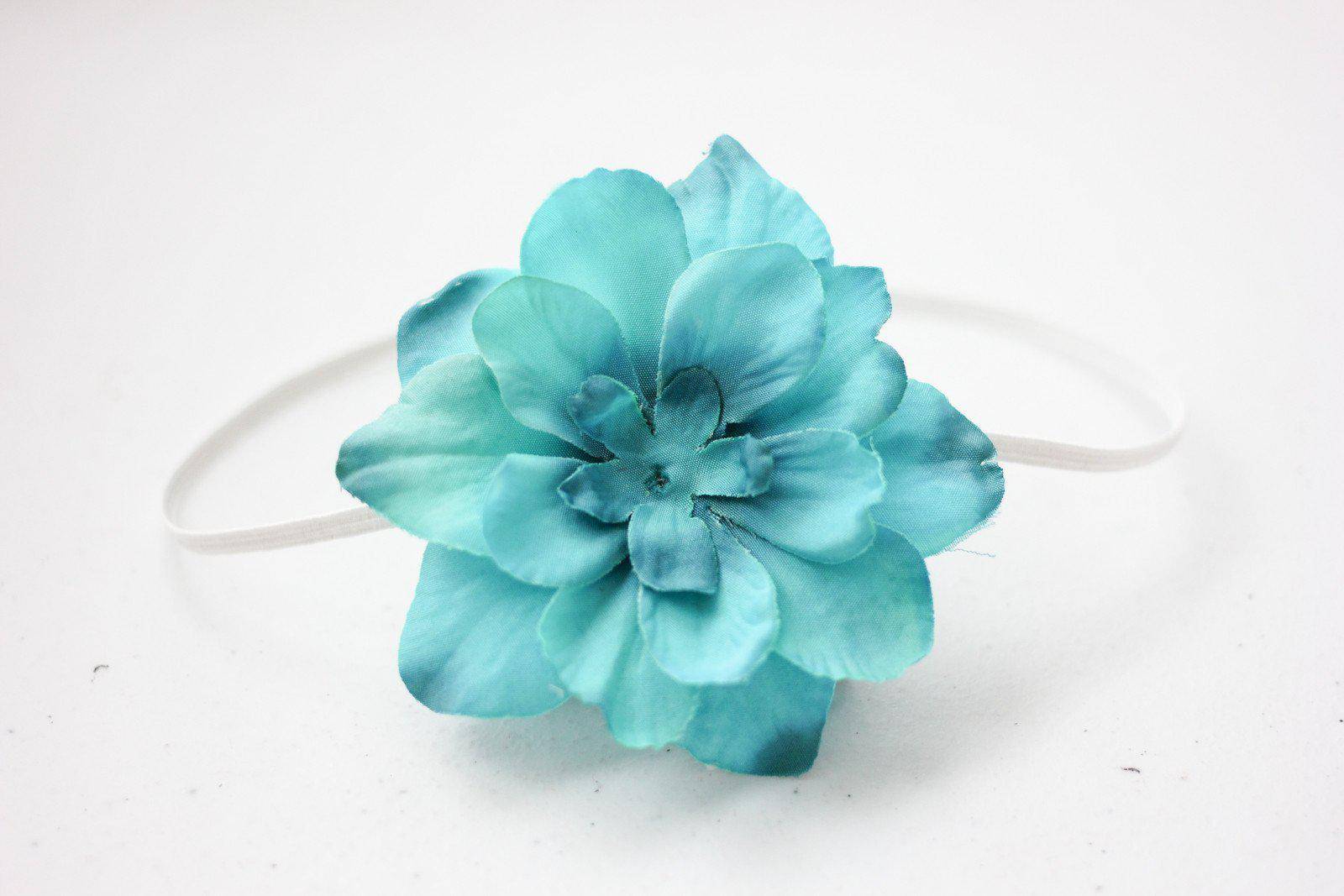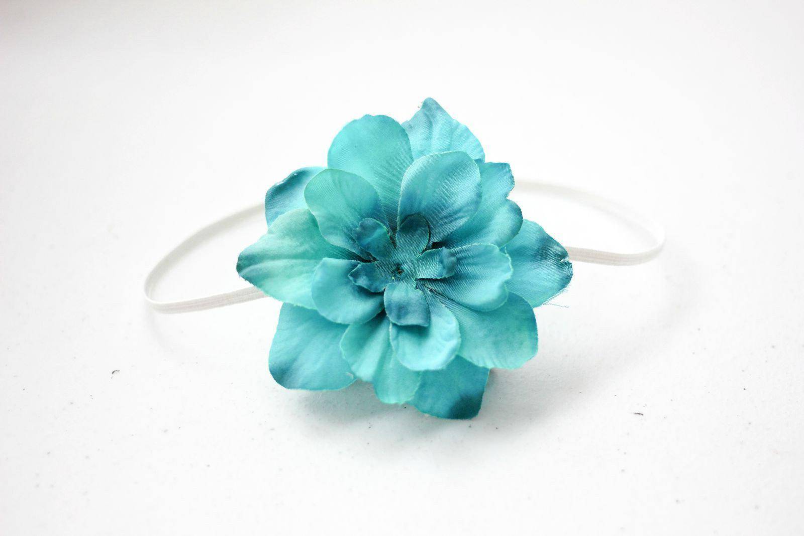 This sweet vintage inspired turquoise blue flower headband is so adorable! The skinny elastic band paired with layers of petals is the perfect piece to wear at any age, from newborn to adult! The cream colored headband is to show how this type of headband looks on a baby.