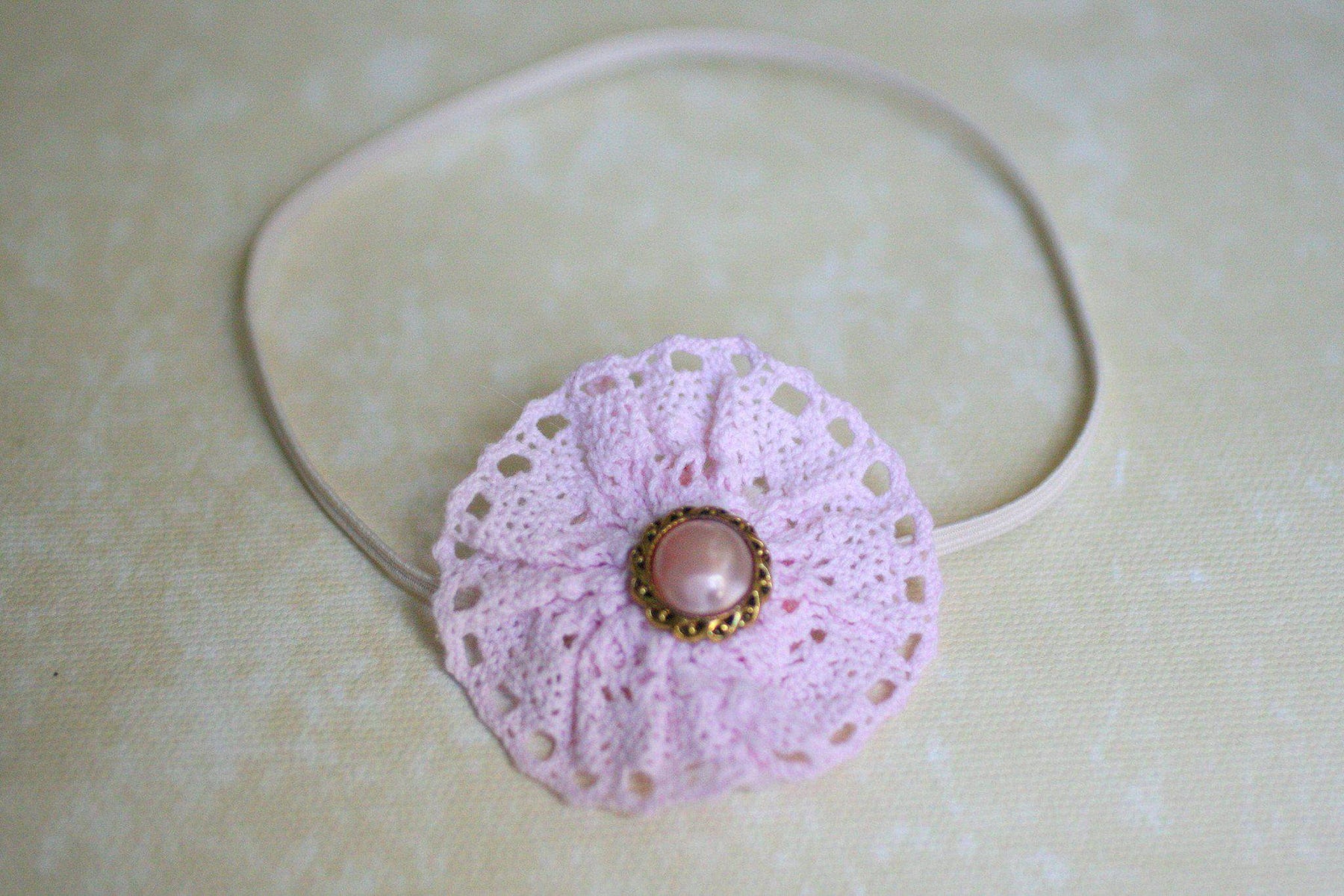 Beautiful victorian pink flower with a pearl center on a skinny white elastic band.